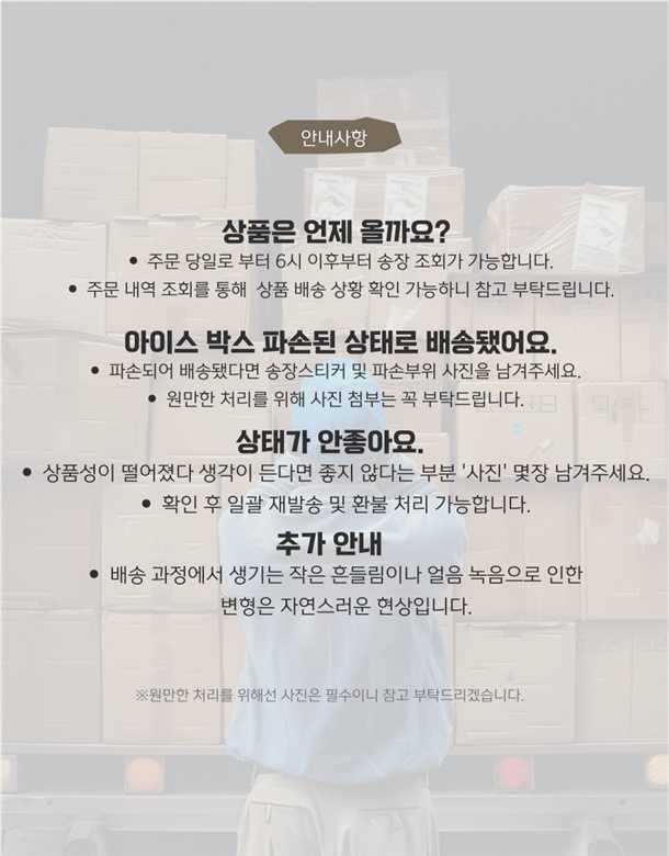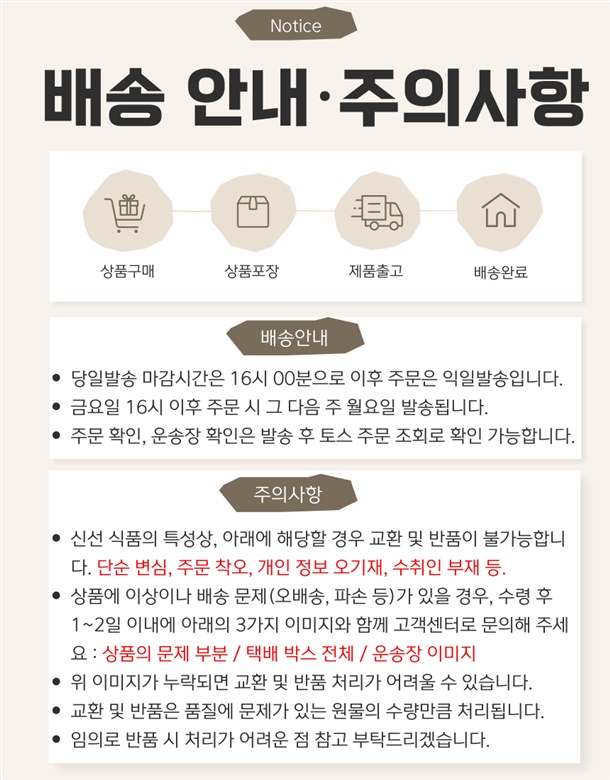 · 배송은 입금확인된 날짜로부터 1~3일 소요되며 최대 7일 이내 제공됩니다. ( 공휴일, 기상악화 등 불가피한 상황에 따라 추가 지연될 수 있습니다.)
